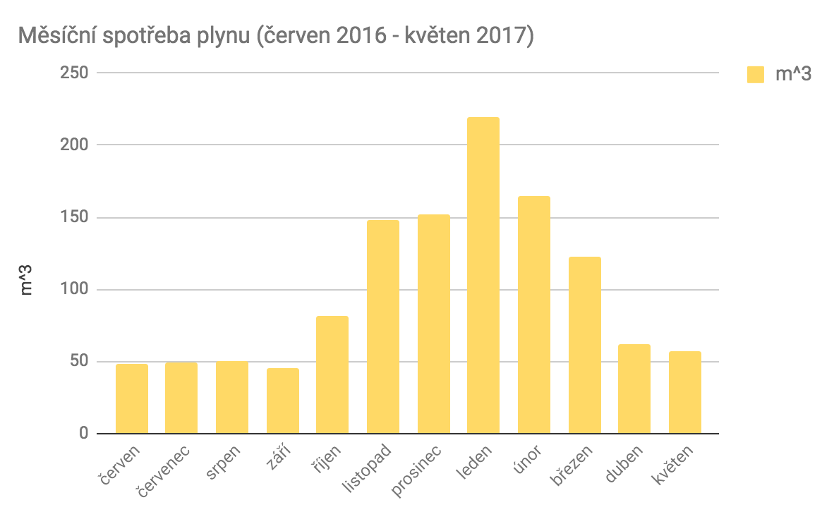 Z grafu je patrné, že plyn se spotřebovává i v létě, zhruba 50 m3 měsíčně. Spotřeba vaření se udává přibližně 10 m3 za měsíc, zbytek je tedy ohřev vody, ten jsme letos doplnili o solární panely (čísla a výpočty návratnosti dodám za rok). Na topení zbývá 600 m3, tedy 9 tisíc korun za rok.