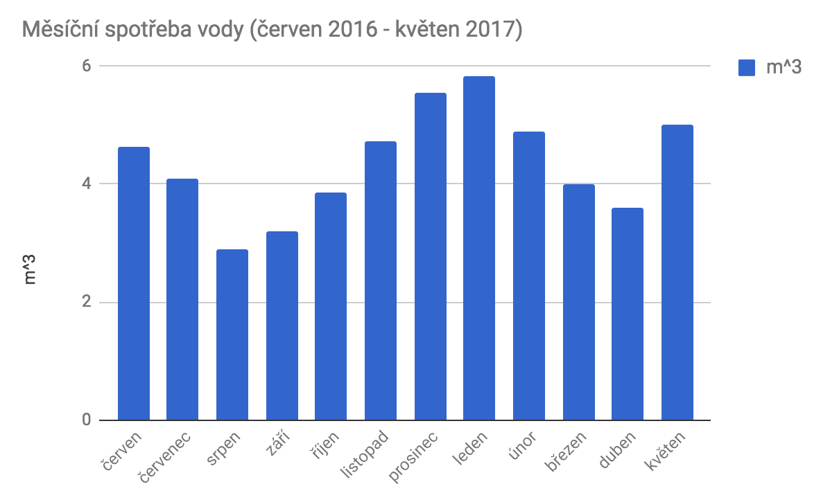 Ze všeho měření mám největší nejistotu právě ve spotřebě vody. Vychází mi na 52,3 m3 za rok, což je 143 litrů na den (ale pro pět osob!). Republikový průměr na člověka a den je zhruba 106 litrů.V uprchlických táborech na syrsko-iráckém pomezí hospodaří s 20 litry na osobu. Ověřit vodoměr není snadné, jelikož nautila čerpá do expanzní nádoby a voda neteče plynule, ale v dávkách. Přeměření malého objemu na jedno sepnutí mi přišlo v pořádku. Chtělo by to zkontrolovat na větším objemu, klidně kubík, ale nechce se mi takhle zbytečně čerpat (třeba se k tomu jednou dostanu).