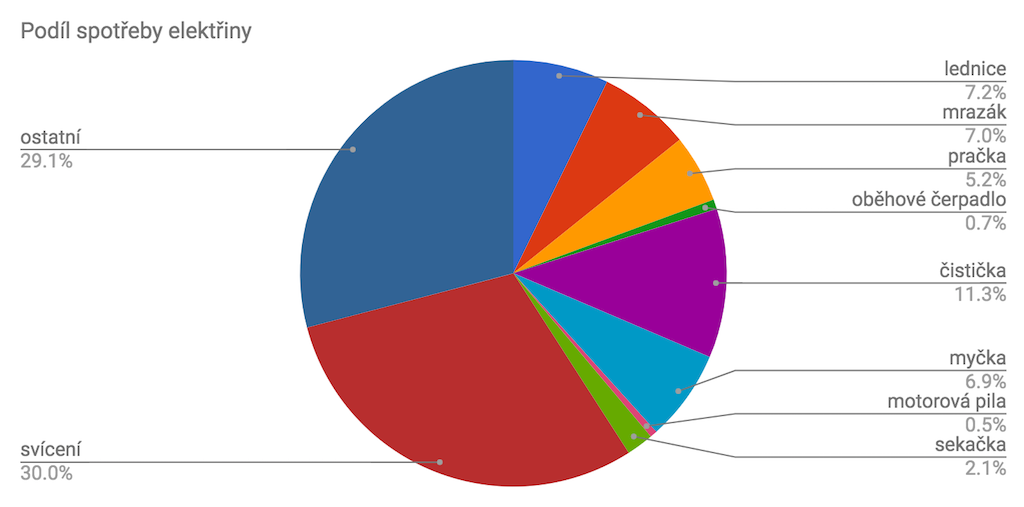 Za rok spotřebujeme 3023 kWh elektřiny, což je zhruba 15 tisíc korun. Kolik spolykají jednotlivé spotřebiče? Něco jako 30 % představuje svícení. Jednu třetinu jsem dokázal přiřadit ke konkrétním spotřebičům a zbytek mám bez určení. Mezi spotřebiče patří lednice (219 kWh), trouba, mrazák (211 kWh), pračka (156 kWh), oběhové čerpadlo (22 kWh), kompresor čističky odpadních vod (342 kWh), varná konvice, myčka (209 kWh), digestoř, fén, žehlička, motorová pila (16 kWh), nautila, čerpadlo na zalévání, sekačka (62 kWh), router a počítače. Je toho dost.