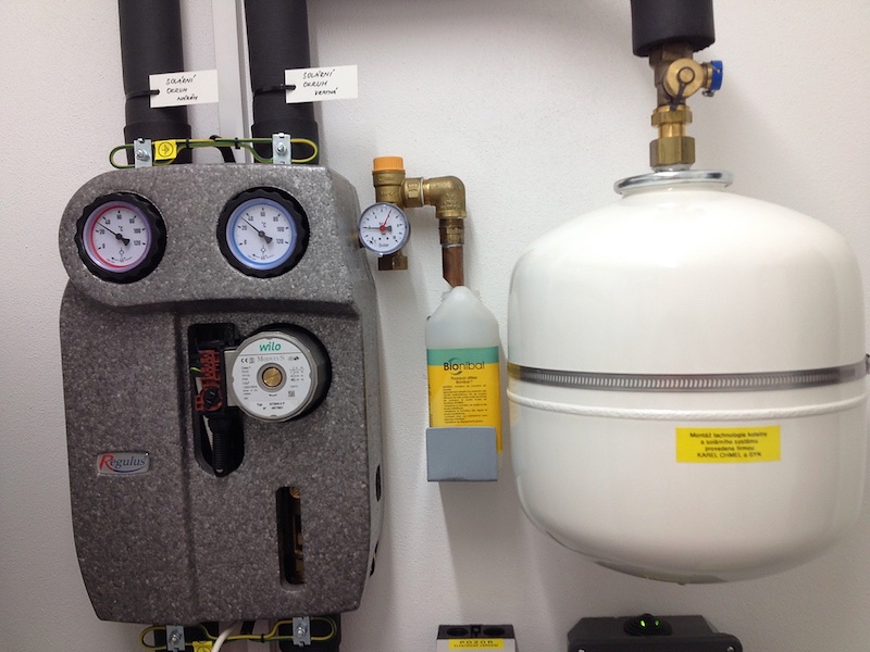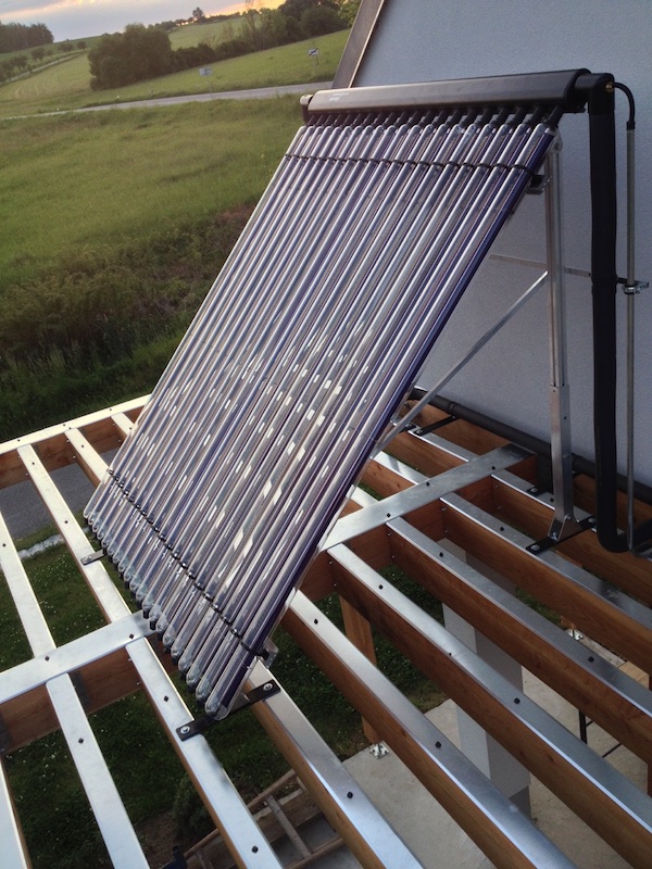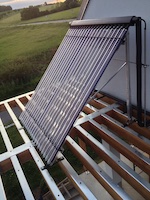 Vybral jsem technologii Brilon Thermomax HP400/450. Jedná se o vakuové trubice, které lze případně vyměňovat i jednotlivě. Dávno už není potřeba se bát přehřívání a odvádět přebytečné teplo někam do bazénu. Kolektory mají ochranu před stagnací (mechanicky se oddělí okruhy). Dohromady mám 20 trubic, 2 m2, ale býval bych užil i 30 trubic, 3 m2.