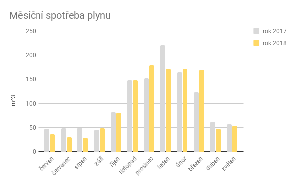 Nejdůležitější je v mém případě plyn, nicméně tím nejen ohřívám vodu, ale i topím. Očistit spotřebu o topení není snadné, skoro až nemožné. Z grafu je vidět, že loni byl teplý březen, letos naopak velmi chladný, ale zato jsme měli letos teplý leden. Co s takovými čísly? Vzal jsem tedy údaje za duben až srpen, kdy se netopí. Vycházím mi úspora 87 m3 (13 % roční spotřeby), díky čemuž jsme ušetřili zhruba 1340 korun.
