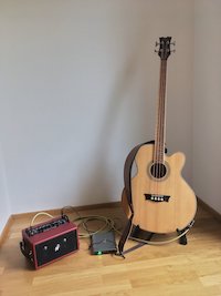 Pořídil jsem si elektro-akustickou basovou kytaru. Všichni mě varovali, že je opravdu tichá. Na cvičení zesilovač nepotřebujete, ale ani na jedinou akustickou kytarou se zpěvem si bez zesilovače nevystačíte. Jak jsem předeslal, mojí hlavní motivací byla hrát u táboráku, tak jsem využil, že Phil Jones vyrábí zesilovač Double Four / BG-75, který je možné přes DC vstup připojit na baterii. Ale pozor, jen verze, která se prodává v USA! Pro EU je certifikovaná varianta s trafem.
