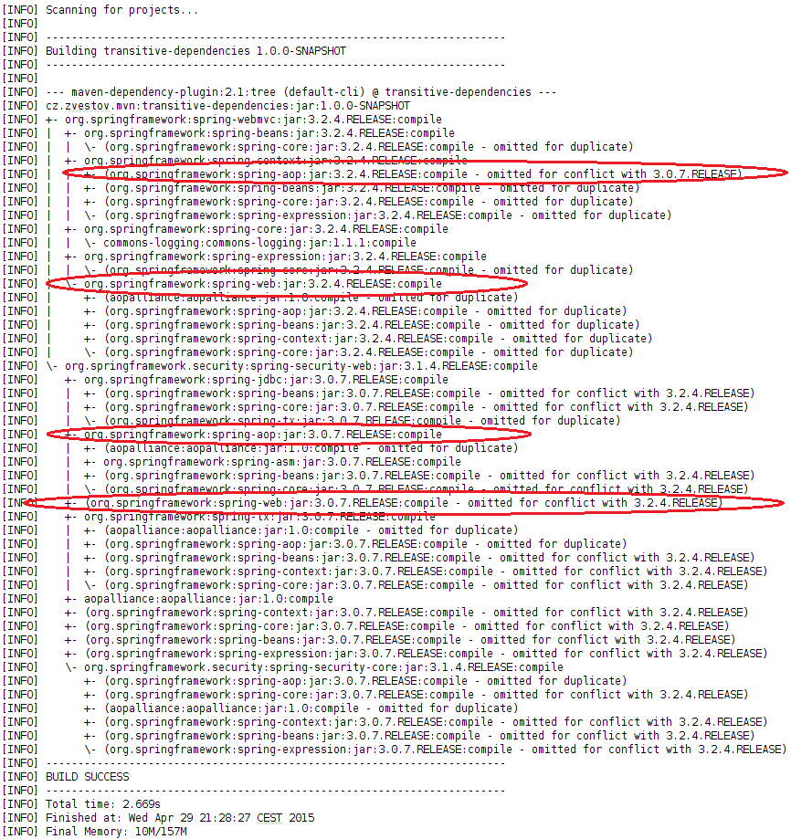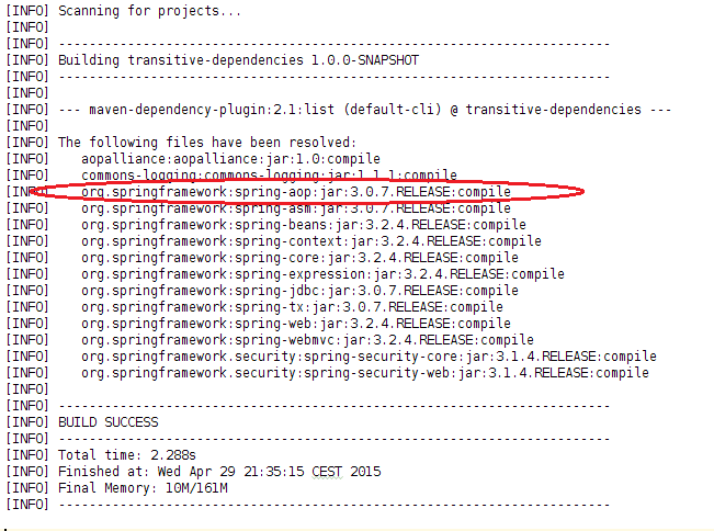 Hm, vidíme spring-aop 3.0.7, zkontrolujme "proč" a to pomocí příkazu mvn dependency:tree -Dverbose