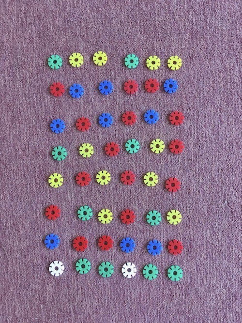 Vezměte cokoliv barevného, čeho máte doma hodně, a připravte řady, které budou mít za úkol doplnit.