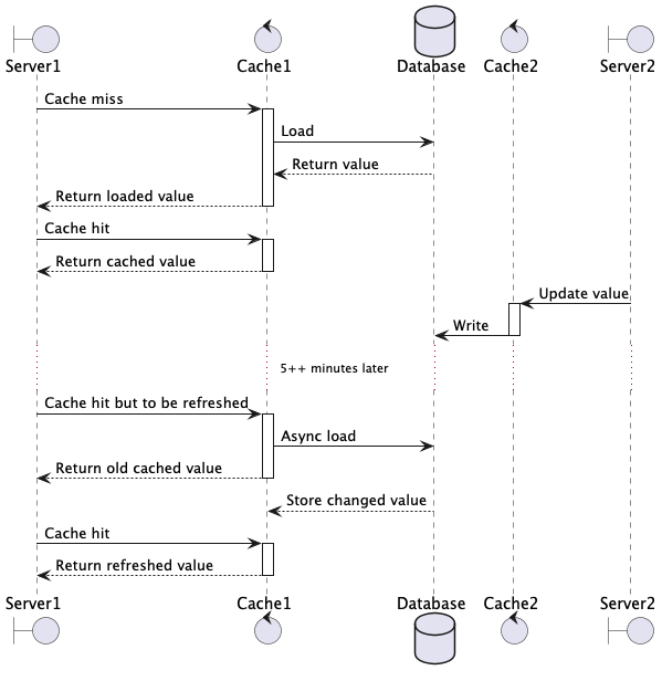 Nastavení refreshAfterWrite=5m totiž není tak tupé, že každých pět minut nahrává hodnotu znovu, ale po pěti minutách je záznam vhodný na refresh.