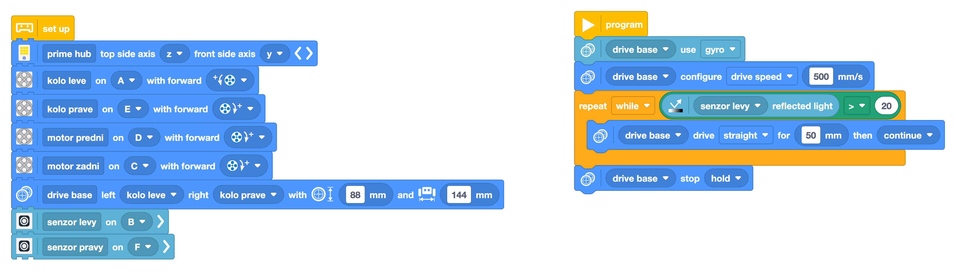 # pybricks blocks file:{"blocks":{"languageVersion":0,"blocks":[{"type":"blockGlobalSetup","id":"bjK,wS1MYO7aiYkFSwd{","x":4,"y":51,"deletable":false,"next":{"block":{"type":"variables_set_prime_hub","id":"{)WuTTGMSJwLS.H*~PKI","extraState":{"optionLevel":1},"fields":{"VAR":{"id":"0ac8)M*M0@okqL6j*T]k"}},"inputs":{"AXIS_TOP":{"shadow":{"type":"blockParametersAxis","id":"G~~=qPiIM)z4Qy;ugq.J","fields":{"VALUE":"z"}}},"AXIS_FRONT":{"shadow":{"type":"blockParametersAxis","id":"=O,F=r_j:y!5C6~`*A2D","fields":{"VALUE":"y"}}}},"next":{"block":{"type":"variables_set_motor","id":"S?(a.C=~LVoJ~3YRo;}.","fields":{"VAR":{"id":"9-KY1{EjNJxUixuEoYJ?"}},"inputs":{"PORT":{"shadow":{"type":"blockParametersPort","id":"pE~{$Zwzpz`i_VDqm^ab","fields":{"NAME":"A"}}},"POSITIVE_DIRECTION":{"shadow":{"type":"blockParametersDirection","id":"VrW-zLpmx[j,+8v+,L[1","fields":{"SELECTION":"Direction.COUNTERCLOCKWISE"}}}},"next":{"block":{"type":"variables_set_motor","id":"3,Y?*Mn1@v9fJ`yYW6Sf","fields":{"VAR":{"id":"@(Mc?VKF9P+IVA!,)0R;"}},"inputs":{"PORT":{"shadow":{"type":"blockParametersPort","id":"r`9bbROX1dwatV7O$.:`","fields":{"NAME":"E"}}},"POSITIVE_DIRECTION":{"shadow":{"type":"blockParametersDirection","id":"Fk;M%s,~BY}0ww1j30bP","fields":{"SELECTION":"Direction.CLOCKWISE"}}}},"next":{"block":{"type":"variables_set_motor","id":"^b]cQj|TmdV%cZJhl0gI","fields":{"VAR":{"id":"#~*U;Y3)}OaA),GbQ/cW"}},"inputs":{"PORT":{"shadow":{"type":"blockParametersPort","id":"?.^x_gX%wU.Xv.#3wRPP","fields":{"NAME":"D"}}},"POSITIVE_DIRECTION":{"shadow":{"type":"blockParametersDirection","id":"0Np/F+n#MjwgBk{6MrPK","fields":{"SELECTION":"Direction.CLOCKWISE"}}}},"next":{"block":{"type":"variables_set_motor","id":"I#`Wxj%/1]|h{X+ZQ;3Y","fields":{"VAR":{"id":"xE_y9@2/n%+##W#h*hFj"}},"inputs":{"PORT":{"shadow":{"type":"blockParametersPort","id":"j1eKhU`bdoHdh)~]Hl2b","fields":{"NAME":"C"}}},"POSITIVE_DIRECTION":{"shadow":{"type":"blockParametersDirection","id":"|$c/*_TuT!~8{cQFN{[f","fields":{"SELECTION":"Direction.CLOCKWISE"}}}},"next":{"block":{"type":"variables_set_drive_base","id":"B@6q{(N{H$OlQN@o(=#7","fields":{"VAR":{"id":"/@.Q%T4BjtqKCq7$UAbr"}},"inputs":{"VAR":{"shadow":{"type":"variables_get_motor_device","id":"h-`^(Zu#NTvZ*mW#2vcD","fields":{"VAR":{"id":"9-KY1{EjNJxUixuEoYJ?","name":"kolo leve","type":"Motor"}}}},"VAR2":{"shadow":{"type":"variables_get_motor_device","id":"CD5,af-R[yO,bE]-?Uf_","fields":{"VAR":{"id":"@(Mc?VKF9P+IVA!,)0R;","name":"kolo prave","type":"Motor"}}}},"VALUE0":{"shadow":{"type":"unit_distance","id":"GNgo@U(M|24Obsy~%4x{","fields":{"VALUE0":88}}},"VALUE1":{"shadow":{"type":"unit_distance","id":"cIT+~l^nylC1%}(,bsKB","fields":{"VALUE0":144}}}},"next":{"block":{"type":"variables_set_color_sensor","id":"0]Gny{r@pu-me0u.qL+H","extraState":{"optionLevel":0},"fields":{"VAR":{"id":"4q7cl%:FR{.%!.~b;=4j"}},"inputs":{"PORT":{"shadow":{"type":"blockParametersPort","id":"HrOt9)|o*,]VPV8SDZ9E","fields":{"NAME":"B"}}}},"next":{"block":{"type":"variables_set_color_sensor","id":"x.AGwFp0|}^R*%F(%TcG","extraState":{"optionLevel":0},"fields":{"VAR":{"id":"^z-R_D5t#~Oky5)7@fjS"}},"inputs":{"PORT":{"shadow":{"type":"blockParametersPort","id":"I!+TlWLqzTDYY6^$uKdf","fields":{"NAME":"F"}}}}}}}}}}}}}}}}}}}}},{"type":"blockGlobalStart","id":"3tJe|AWl0baN(wH9a$@.","x":990,"y":44,"deletable":false,"next":{"block":{"type":"blockDriveBaseUseGyro","id":"W=Lm:RpeA}v?nKUf*^6.","fields":{"METHOD":"DRIVEBASE_USE_GYRO_TRUE"},"inputs":{"VAR":{"shadow":{"type":"variables_get_drive_base_device","id":"i{6(E*p~D3tY|M-^UtvG","fields":{"VAR":{"id":"/@.Q%T4BjtqKCq7$UAbr","name":"drive base","type":"DriveBase"}}}}},"next":{"block":{"type":"blockDriveBaseConfigure","id":"g3I/xPp1/oeRSee5-LA^","extraState":{"optionLevel":1},"fields":{"METHOD":"DRIVEBASE_STRAIGHT_SPEED"},"inputs":{"VAR":{"shadow":{"type":"variables_get_drive_base_device","id":"Z+6V|uC*Z3_Z4Pd$0di/","fields":{"VAR":{"id":"/@.Q%T4BjtqKCq7$UAbr","name":"drive base","type":"DriveBase"}}}},"ARG0":{"shadow":{"type":"unit_speed","id":"oc%m!QtUlj%nS}0wUkdH","fields":{"VALUE0":500}}}},"next":{"block":{"type":"blockFlowWhile","id":"^w![3wsmge-,nl%)9)_2","fields":{"MODE":"WHILE"},"inputs":{"BOOL":{"shadow":{"type":"blockLogicTrue","id":"|%RuaCQaVxPi_*BB*Hea"},"block":{"type":"blockLogicCompare","id":"0-l;i-(OX+f@B$[%Nv?7","fields":{"OP1":"GT"},"inputs":{"A":{"shadow":{"type":"blockMathNumber","id":"0R9k4vfG#^mUZ#xuV!Yy","fields":{"NUM":3}},"block":{"type":"blockLightReflection","id":"xPaTrirocgrfw:z($hfN","inputs":{"VAR":{"shadow":{"type":"variables_get_light_intensity_device","id":"DOR_9uhk=S}7mpH~6ny:","fields":{"VAR":{"id":"4q7cl%:FR{.%!.~b;=4j","name":"senzor levy","type":"ColorSensor"}}}}}}},"B":{"shadow":{"type":"blockMathNumber","id":"=Fis}(OW{eVsQ%GL+Xv?","fields":{"NUM":20}}}}}},"DO":{"block":{"type":"blockDriveBaseDrive2","id":"e!qh#u{yRC]5T}d88!wD","extraState":{"optionLevel":2},"fields":{"METHOD":"DRIVEBASE_DRIVE_STRAIGHT"},"inputs":{"VAR":{"shadow":{"type":"variables_get_drive_base_device","id":"Fn3J0txHNG:z99+vK!pI","fields":{"VAR":{"id":"/@.Q%T4BjtqKCq7$UAbr","name":"drive base","type":"DriveBase"}}}},"ARG0":{"shadow":{"type":"unit_distance","id":"Zf;zZ*m@T_Mm5%_U]r.u","fields":{"VALUE0":50}}},"ARG1":{"shadow":{"type":"parameters_stop_4","id":"m4%XtpLADnb=l]x@*bmt","fields":{"VALUE":"Stop.NONE"}}}}}}},"next":{"block":{"type":"blockDriveBaseStop","id":"FQcgVD9TN#4W;ib{Q}Dj","inputs":{"VAR":{"shadow":{"type":"variables_get_drive_base_device","id":"sJ%~bnFg:!9s?/VX*/M(","fields":{"VAR":{"id":"/@.Q%T4BjtqKCq7$UAbr","name":"drive base","type":"DriveBase"}}}},"VALUE0":{"shadow":{"type":"parameters_stop_3","id":"ELOu@BWpK(Ie4(+d)AL_","fields":{"VALUE":"Stop.HOLD"}}}}}}}}}}}}}]},"variables":[{"name":"red","id":"^TRnlnrf1|b]54?=RSAE","type":"ColorDef"},{"name":"orange","id":"T/Ga=6s={mOa/4,vyj]{","type":"ColorDef"},{"name":"yellow","id":"z6p)=?w#+g|y@lU:VFt*","type":"ColorDef"},{"name":"green","id":"PQR$ys-f%#*T_4`Rx0fH","type":"ColorDef"},{"name":"cyan","id":"n3GEOv6@N!|xg_x}=G
