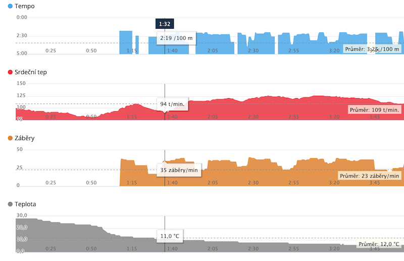 Moje analytická mysl je posedlá měřením. Ostatně otužování byl důvod, proč jsem si koupil Garmin Forerunner 945, staré hodinky totiž měřit ve vodě nezvládly. Zajímalo mě, jaký vliv má studené voda na můj tep. Níže je záznam z jednoho plavání v ledové vodě. Údaj o teplotě je nespolehlivý, protože se bere ze zápěstí. Stejně taky neberu vážně vzdálenost, zajímá mě především čas a tep. Graf názorně ukazuje, že první minutu ještě neplavu. Je vidět prvotní šok, pak vyklidnění a následná fyzická aktivita.